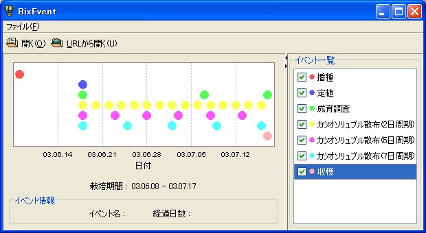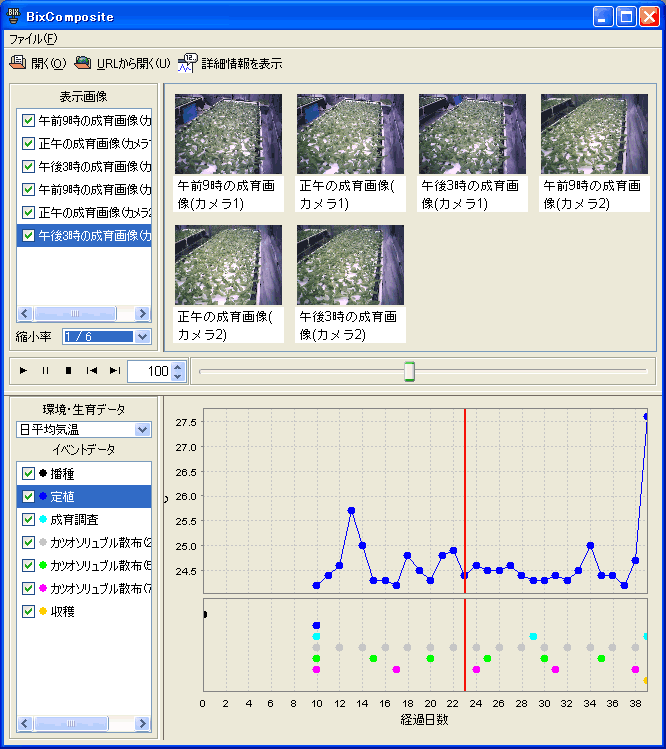 Integrated Production Information Viewer (BixComposite) The growth images, environment data, growth data, production working records, etc. can be displayed all in one. Each record is linked by each other using the date. It also can be played like an animation. The application software was developed by the Eclipse environment. The Java software is needed for execution, and please double click the executable .JAR extension file. |