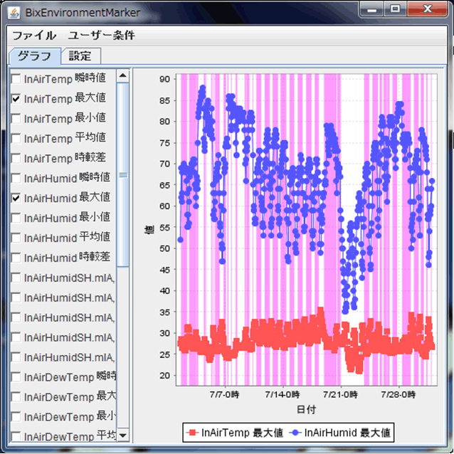 Environment trend graph mark up application (BixEnvironmentMarker) @Using the BIX-pp format data produced by the UECS monitor software and the Ubiqutous Environment Control System (UECS), the application software draws a trend graph, and marks up the graph area in the specific environmental conditions. You can find easily to the critical period in the plant production, for example, disease outbreaks, continuations of good for plant growth conditions, failure of environmental control etc. The application software was developed by the Eclipse environment. The Java software is needed for execution, and please double click the executable .JAR extension file. @The application suits for the BIX-pp format file that is output by the UECS monitor software, manifuctured by Stella Green Co. |