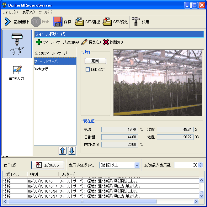 Program for production information automatic operation collection (BixFieldRecordServer) It is a program that can easily record a variety of plant production information by the BIX-pp form. A temperature, environmental information such as humidity, and the plant growth image, etc. can be recorded automatically by the use of the field server and the Web camera set up on the production site. Moreover, information on necessary cultivation management work and growth measurement information for the production analysis, etc. can be supplemented with a manual input. @It is developed with the Java language and Eclipse. The application software was developed by the Eclipse environment. The Java software is needed for execution, and please double click the executable .JAR extension file. This program corresponds to field server II made of Erabo experience. please see Field Server:Home for details of the field server. It corrected it to the latest version.(July 31, 2006) |