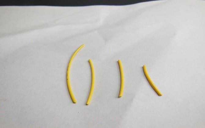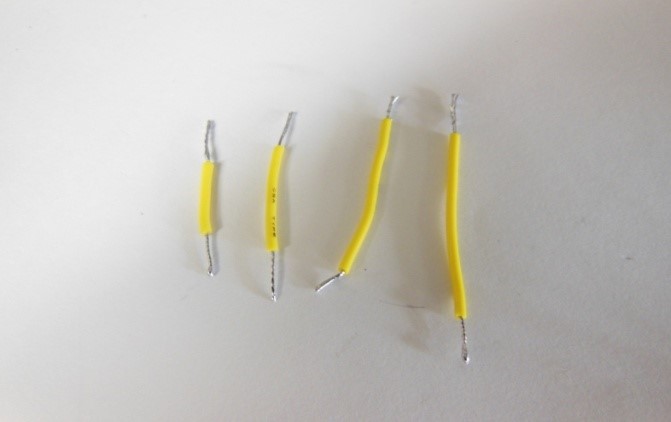 白のビニール被覆電線を約2cm・2.5cm・3cm・4cmに切る。計4本。