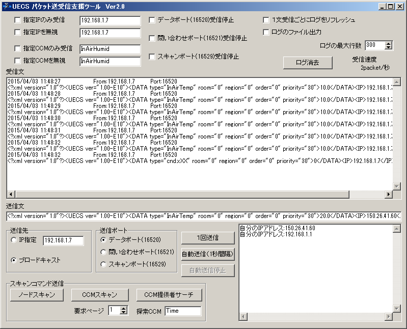 ################################################## UECS パケット送受信支援ツール Ver2.1 2015.11.18 Hideto Kurosaki ################################################## ●動作環境 Windows2000,WindowsXP,Windows7,Windows8.1で動作確認済みです。 WindowsXP以降では初回起動時にネットワークの使用に関する警告が 出ることがありますが通信を許可して下さい。 本ツールと同様のUDP受信機能を持つソフトウェアとは競合するため 同時に起動できないことがあります。 ●UDP受信 UECSで多用されるUDP通信の状態をモニターすることができます。 機能は単純で16520,16521,16529ポートから何か受信次第表示します。 ブロードキャストされるパケットはサブネットが一致していなくても受信可能です。 そのため、PCに接続されたノードが動作していれば何らかの文字列が表示されます。 (http通信はサブネットを一致させないとアクセスできないのでご注意下さい) なお、ブロードキャストパケットと、PCのIPアドレスに対して送られる以外のパケットは受信できません。 注意:本ツールで扱えるパケットの受信速度は最大で秒間200パケットまでです。 ●UDP送信 送信文の欄に書かれた文字列をUDP送信します。 IPアドレスを指定しての送信、あるいはブロードキャストすることができます。 自動送信ボタンを押すと1秒間隔で自動送信されます。 もし、PCに複数のLANポートがある場合、ブロードキャストは一番優先度の高い 1つのLANポートにのみ行われます。 このような条件でパケットがUECSノードに到達しない場合、IP指定送信を行って下さい。 (意図したポートにブロードキャストしたい場合、それ以外のポートはケーブルを抜いて下さい) ●スキャンコマンド送信 3種類のコマンドを送信できます。 ・ノードスキャン LAN内に接続されたUECSノードに応答を求めます ・CCMスキャン(通信子スキャン) ノードの持つ、発信可能なCCMのリストを要求します。 パケットサイズに収まらない場合、複数のページに分割されることがありますので ページ番号を指定して要求を出します。 ・CCM提供者サーチ 特定のCCMを持つノードを探索します。 探索CCM欄に探したいCCMのtypeを入力してください。 注意:UARDECSはスキャンコマンドには対応していません ●ログのファイル出力 この項目をチェックすると、このツールの実行ファイルのあるフォルダに"receive.txt" というファイルが生成されて受信した文字列が逐次書き出されます。 ●その他 Ver2.1以降でウィンドウの横幅を変えると、ログ表示欄の横幅も変わるようになりました。 ●注意事項 このツールを利用したことによって生じたいかなる結果についても責任を負うことはありませんので自己責任の上で使用して下さい。 |