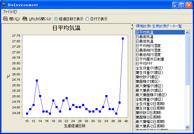 Numerical Record Viewer (BixEnvironment) Records of numerical environment data and plant growth data in the BIX-pp file can be displayed in the line graph. The application software was developed by the Eclipse developing environment. The Java software is needed for execution, and please double click the executable .JAR extension file. |