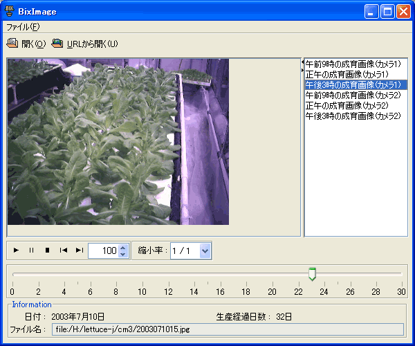 Integrated Production Information Viewer (BixComposite) The growth images, environment data, growth data, production working records, etc. can be displayed all in one. Each record is linked by each other using the date. It also can be played like an animation. The application software was developed by the Eclipse environment. The Java software is needed for execution, and please double click the executable .JAR extension file. |