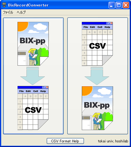 Data Record Converter (BixRecordsConverter) The environmental measurement data described by CSV (comma separated value format), growth measurement data, image data, voice data, and work data are changed into BIX-pp format. Moreover, these data of BIX-pp format is convertible also for csv format.The application software was developed by the Eclipse environment. The Java software is needed for execution, and please double click the executable .JAR extension file. |