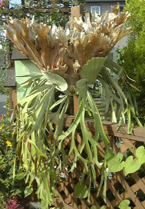 これは、ナガバビカクシダ(Platycerium bifurcatum ssp. willinckii)と呼ばれるジャワ原産のウラボシ科の羊歯の仲間です。細長く伸びている葉がまるで鹿の角(ビカク)に似ているので、こういう名前がつきました。この植物の特徴は二種類の葉を持っていることです。自分自身を覆っている幅の広い葉は、ネストリーフ(栄養葉)と呼ばれていて、鳥の巣のようなすり鉢状の形状を作り、その中に落ち葉や自分の葉の腐ったものを蓄え、それに雨水を吸収保持させて、成育するために使用します。雨水をうまく利用し、肥料を貯えているので、空中で生活できるのです。もう一つの、鹿の角のような葉は、フォリッジリーフ(生殖葉)と呼ばれていて、次の写真のように、裏にはびっしり胞子がつきます。