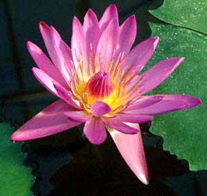 ネッタイスイレン(Nymphaea cv. 'Mrs. M.L.Randing')ヒツジグサ科 温帯性のスイレンと美しさで一線を画すのが、このネッタイスイレンです。耐寒性はやや弱いのですが、水中から空中に首を伸ばして咲く花の色はとても鮮明で、一見の価値があります。葉も縁がぎざぎざになっている品種が多く、温帯性スイレンとの区別ははっきりしています。昼に咲くものだけでなく、夜に咲くものもあり、大輪のものもあり、また、香りのすばらしいものもあるなど、魅力の大きな植物です。この花を観賞するのならば、静岡県の伊豆にある熱川バナナワニ園に温室ひとつ分のコレクションがあり、温泉の熱で周年花を付けています。昔は、小型のコロラータという品種しか一般には手に入らなかったのですが、最近では、多種の苗が市販されるようになってきて、ウォーターガーデンを華やかに演出する役者がまたひとつ増えました。 |