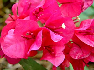 ブーゲンビレア(Bougainvillea cv.)オシロイバナ科 この色も大変人目を引きます。ただ、人目を引くのは本当の花ではなく、苞(ほう)と呼ばれる部分です。とげのある茎でつる植物のように、ものに引っかかりながら高く伸びで、数多くの花をつけます。ただ、寒さには少し弱く0℃以下になると枯れてしまいますので、保護が必要です。日本では鉢植えにして育てます。水を控えて締めて作ると、枝もあまり伸びず、花もよく咲かせます。沖縄などでは盆栽に仕立てることもあります。 |