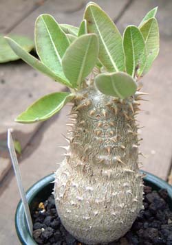 多肉植物というのは、一般に、サボテン科の植物を除いて、押し葉にすることができない植物の集合を指します。つまり、乾燥に耐えるため植物体の一部を肥大化・肉厚化させて貯蔵器官にしています。葉を肥大させたものは葉多肉植物(Leaf Succulents)と呼ばれます。左上の写真はベンケイソウ科のオーロラ(Sedum rubrotinctum cv.'Aurora')と呼ばれるものですが、葉が丸々と肥大して多肉になっています。光合成する主要器官の葉が貯蔵器官を兼ねている例です。コノフィツムなどのメセンの仲間も、2枚の葉が肥大した多肉植物です。 また、葉が無いか、痕跡程度か、すぐに落ちてしまうかして、茎が肥大した茎多肉植物(Stem Succulents)というのもあります。その一例として、上中の写真は、トウダイグサ科のオベサ(Euphorbia obesa)という植物です。まるで野球のボールのようです。葉がなくなり、茎だけが球状に多肉化しています。上に見えるのは花です。全体的に多肉化している、これらの比較的良く見られる多肉植物と一線を画すのが、これから紹介する植物です。 |