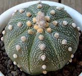 | 有星類の代表であるカブト(Astrophytum asterias)です。王侯貴族のかぶる冠のようなサボテンです。愛好家は、白点の入り方、星の盛り上がり方などで細かく評価して、投機的な金額がつくことさえあります。 | ボタン類の花牡丹(Ariocarpus furfurceus)イボの形や綿毛、そして秋に咲く花の魅力は、はまりこむと何株でもコレクションしたくなるそうです。原産地では、岩陰などの土に埋もれていて初心者には見つからないそうです。 | 黒牡丹(Roseocactus kotschoubeyanus)爪のような形で花も美しい。成長は遅く、順調に育っても一年でたった数mmしか大きくならない。地下に大きなカブ状根がある。 |