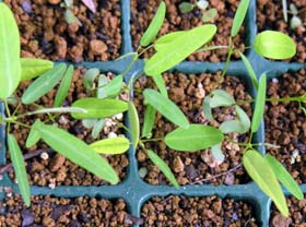 左上のオジギソウの写真に一緒に写っているマツバボタン(Portulaca gradiflora)の花のおしべも運動をすることが知られています。マツバボタンの花が咲いていたら、左の写真の矢印で示したおしべをようじなどて触ってみてください。もぞもぞと動くのが観察できます。やってきた昆虫などに花粉がつきやすくしているのではないかと思われます。 一方、めしべが運動するものとしては、ハナウリグサ(トレニア、Trenia fornieri)が知られています。右の写真の中央に見える先端が二股に開いためしべに触れると、見る間に閉じてしまいます。まるで、受粉した花粉を逃さないようにしているかのようです。 比較的変わったものとして、オジギソウと反対側に葉をたたむ植物として、カタバミ科のオサバフウロの仲間があります。下左2枚の写真は、コダチオサバフウロ(Biophytum dendoroides)です。これは、触るとゆっくりと葉をたたみます。もっと運動が活発なものに、下右の写真のオサバフウロ(Biophytum sensitivum)があり、黄色い花を咲かせます。クリックすると動画が見られます(Windows Media Player 9用、サイズ448kB、5秒)。中国では感応草と呼んでいます。種子はあまり市販されていませんが、熱帯地方では雑草化している植物です。温室などでは、カタバミの様に種を飛ばすので、いろいろな所に勝手に生えて始末に悪い植物です。もし、オサバフウロの種子を入手したら、できるだけ高温(最低でも25℃以上)で発芽させることが栽培のコツのようです。 オジギソウのように接触で葉をたたむ植物はいろいろと知られていますが、オジキソウを超えるような敏感、かつ、高速な運動をする種類は無いようです。オジキソウの種や苗は良く市販されていて、入手が容易ですが、それ以外の種類を日本で入手しようとすると困難なのは、栽培に苦労する割には面白みが少ないからなのでしょう。 |