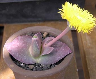 大きくならずに想像を超えた形態変化をするのが、下の写真のケイリドプシス・翔鳳(しょうほう)(Cheiridopsis peculiaris)です。3枚の写真は全て同じ植物の季節変化です。左が春に開花したときの写真です。2枚の葉の中から、2つの芽のようなものが出ていますが、右が新芽で左が花芽と、左右で必ず違います。二つに増えようとしているのではないのです。やがて花が終わると、左側の芽を残して全て夏には枯れてしまいます。やがて、水やりを中止すると左側の芽の先端から少し出ている新葉以外はすべて枯れてしまい休眠します。初秋には真ん中の写真のような状態になり、生育を再開します。この状態は、細長い白っぽい石が立っているような感じです。やがて、右端のように、新葉が展開し、やがて、冬になるとその中心から左の写真のように2つの役割分担をした芽が伸びだします。このようになかなか増殖はしませんが、形態変化のリズムに合わせて水やりをすれば、それぼと栽培は難しいほうではありません。