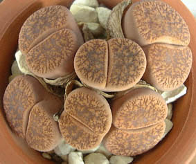 これらの植物はアフリカ原産で、半年ぐらい生育すると、半年ぐらいの生育に適さない時期は休眠してしまいます。右の写真は、休眠している状態です。まるで枯れてしまったように見えますが、中で、新しい植物体が育っています。調子がいいと、ひとつが2から3個に殖えます。休眠しているときには、ますます、石ころに紛れて見分けがつきにくいのです。