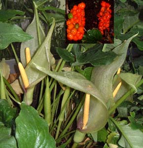 サトイモ科の植物は、花が集まって穂のような形をした肉穂花序(にくすいかじょ)という構造の花をつけます。そして、花序の基部には特別な苞葉が付きます。この苞葉を仏炎苞(ぶつえんほう)と呼びます。本来の花である肉穂花序よりも仏炎苞の方が目立つ種も多いです。例えば、サトイモ科のミズバショウ(Lysichiton camtschatcense)の花の色を白と感じるのは、実は目立つ仏炎苞の色なのです。左の写真は、切花などでお馴染みのアンスリウム(Anthurium andreanum cvs.)です。これも、仏炎苞に観賞価値があるので、赤色のアンスリウムとか、白色のアンスリウムと呼ぶのです。 右側は、地中海地方原産のアルム・イタリカム(Arum italicum)です。葉に白斑が入るものが普通ですが、写真は入らない品種です。花の形からサトイモ科の植物であると分かりますよね。花が咲いた後、写真上のような赤い実がなります。実のなる位置で、棒状の部分が花だったことが分かります。 |