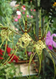 | ラン科植物には、面白い形をした花をつける仲間がたくさんいます。特に、ブルボフィルム(Bulbophyllum)属とキルホペタルム(Cirrphopetarum)属には変な形の花を咲かせるものが多いです。右の2枚の写真は、キルホペタルムの栽培品種(Cirrphopetarum Elizabeth Ann "Backleberry")です。花弁がひげのように20cm程度下垂します。中心部を拡大したものが、その右です。複雑で変わった色彩をしています。ピンク色をした舌のような形をしたものを唇弁(しんべん)と呼びます。この仲間は、この唇弁の付け根が蝶番のようになっていて、わずかな風で上下にピクピク動きます。虫の注意をひきつけるためでしょうか?、その理由はわかりません。 下の左は、ラン科のオンキディウム(Oncidium、オンシジューム)属の花です。スズメランという和名がつけられていますが、英名のダンシング・レディ(踊る貴婦人)のほうがふさわしい名前だと思います。左の写真を見てください、冠をかぶって、パーティドレスに身を包んでいる人の姿にそっくりだと思いませんか。下中央は、オンキディウムに近縁のブラッシアの1品種(Brassia Eternal Wind "Summer Dream")です。これは、花の形が蜘蛛に良く似ているので、俗にクモラン(この和名を正式に持つ別の植物がある)と呼ばれることもあるくらいです。ジョロウグモのような花ですね。 右下の写真は、キクノチェス・クロロキロン(ventricosum var. chrorochillon)という、ベネズエラ〜コロンビア原産のラン科植物です。スワン・オーキッドと呼ばれるように、白鳥の姿に大変良く似た、緑白色の清楚な花を夏に咲かせます。 |